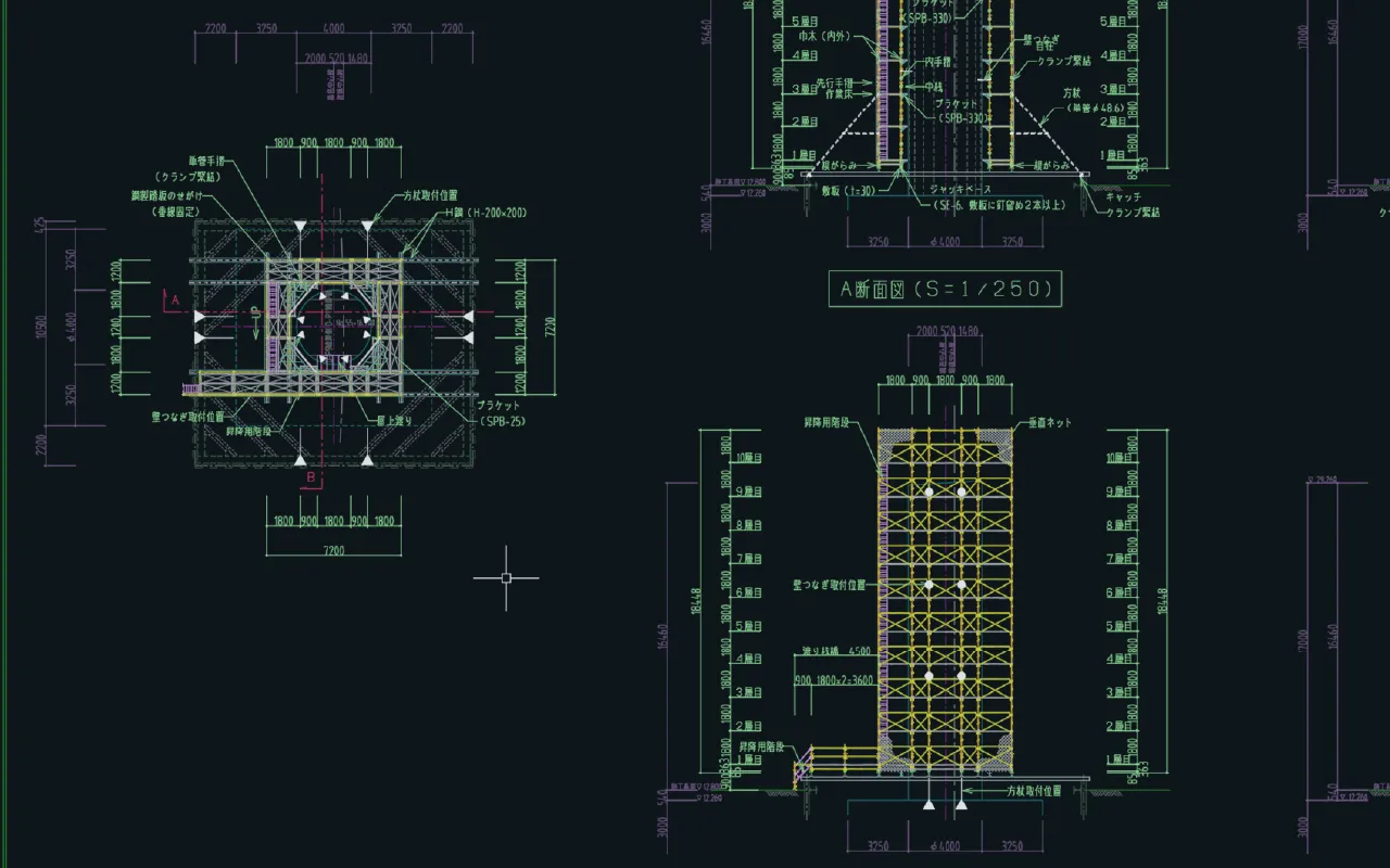 強度計算も含め、安全性・経済性・施工性を考慮した仮設計画図面をご提供致します。労働基準監督署の足場届けに必要な図面も製作致しております。